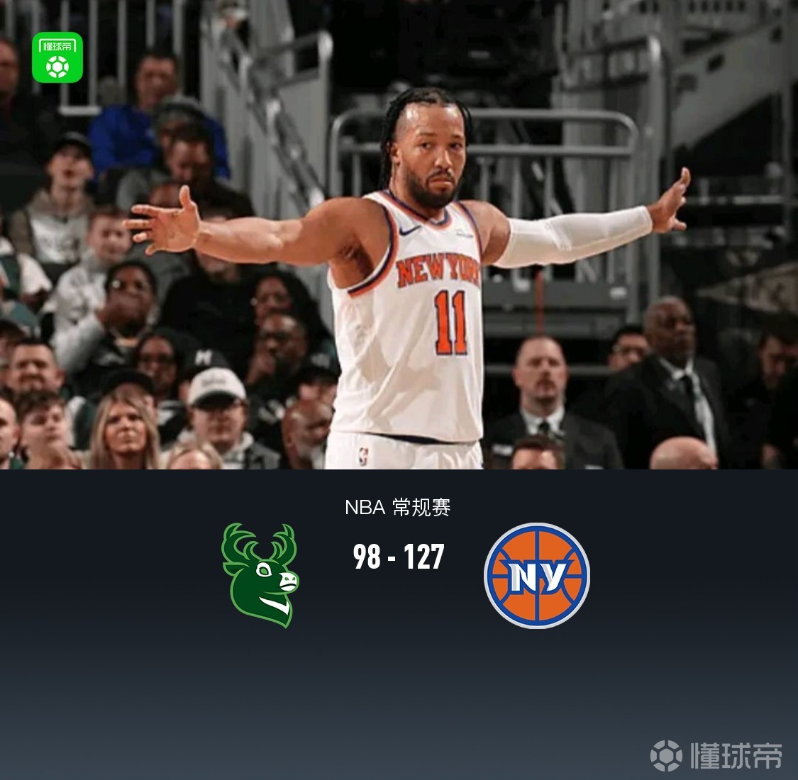 尼克斯7人上双127-98大胜雄鹿,布伦森27+7,唐斯17+13