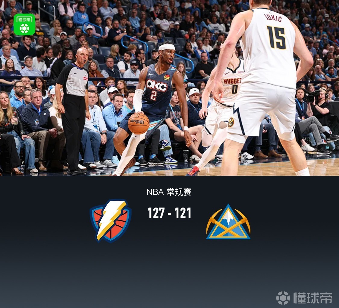 最终雷霆127-121掘金。俄克拉荷马雷霆亚历山大36分3板9助,霍姆格伦15分21板3助;丹佛掘金贾马尔-穆雷39分8板6助,约基奇23分17板14助。