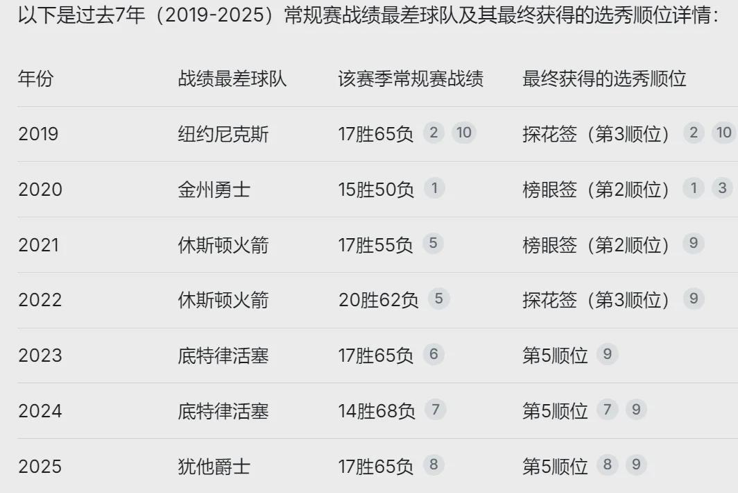 上赛季爵士17胜65负联盟倒数第1,有14%的概率抽中状元签,52.1%的概率抽到前4顺位,但爵士最终只抽到了5号签。独行侠39胜43负联盟倒数第11,以1.8%的概率抽中状元签。有两位NBA老板爆料,独行侠这个状元签是内定的。
