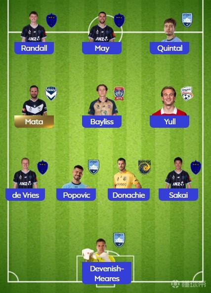 中场:马塔(墨尔本胜利)、拉克伦-贝利斯(纽卡斯尔喷气机)、尤尔(阿德莱德联)