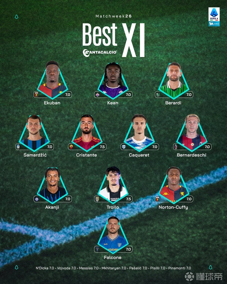 北京时间2月24日,意甲官方评选出了意甲第26轮的最佳11人阵容,莫伊塞-基恩、贝拉尔迪、克里斯坦特、贝尔纳代斯基和阿坎吉入选。