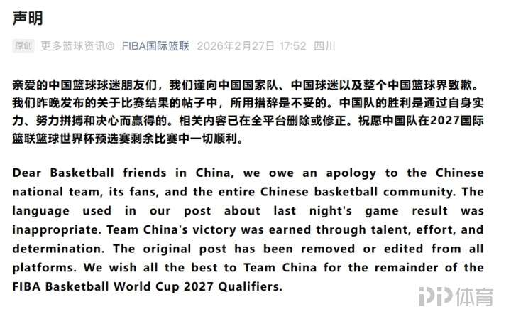 Dear Basketball friends in China, we owe an apology to the Chinese national team, its fans, and the entire Chinese basketball community. The language used in our post about last night's game result was inappropriate. Team China's victory was earned through talent, effort, and determination. The original post has been removed or edited from all platforms. We wish all the best to Team China for the remainder of the FIBA Basketball World Cup 2027 Qualifiers.