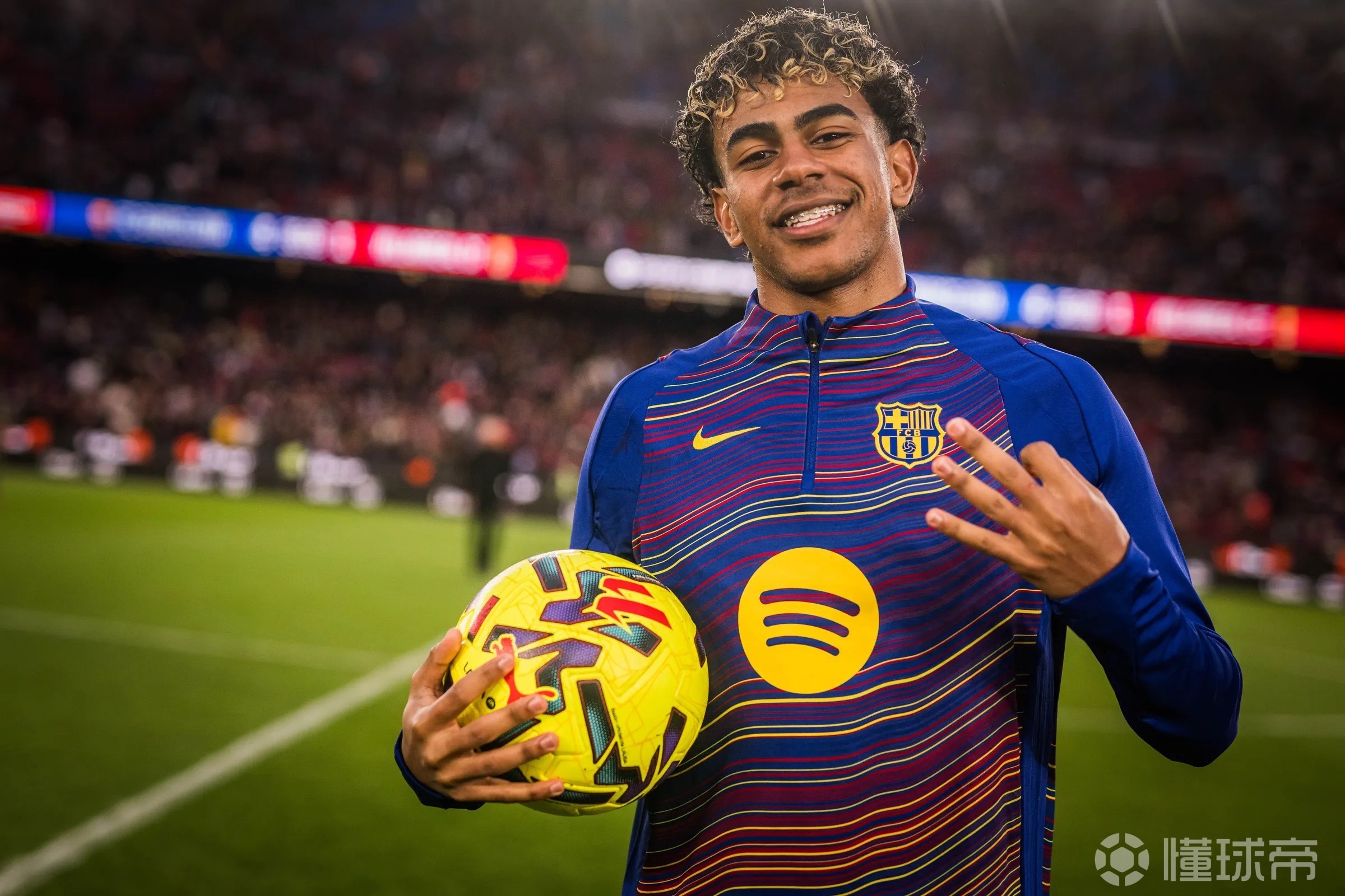 西甲第26轮,巴塞罗那主场4-1击败比利亚雷亚尔,此役上演职业生涯首次帽子戏法的亚马尔赛后将比赛用球带走收藏。