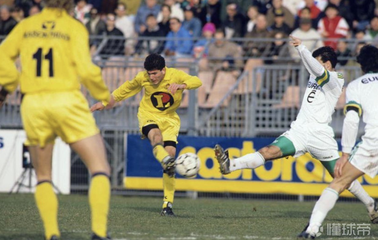 齐达内:这是在戛纳,那时候我还有头发(笑)。我在法甲主场对阵南特的第一粒进球(1991年2月10日,2-1)。我在法甲的第一场比赛也是对南特,不过是在客场拉博若瓦球场(1989年5月20日,1-1)。我在比赛还剩十分钟时替补登场。那时候每队只有两名替补。我和博罗-普里莫拉茨一起坐在替补席上。是让-费尔南德斯派我上场的。