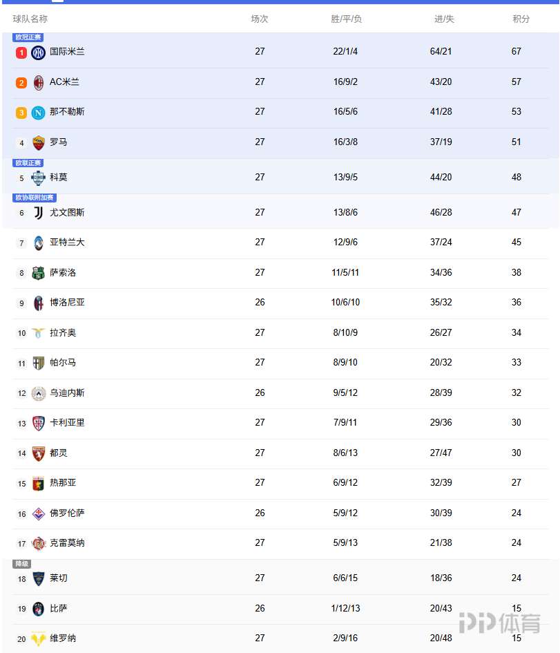 意甲积分榜:尤文4轮不胜距前四4分,罗马仍第4落后那不勒斯2分